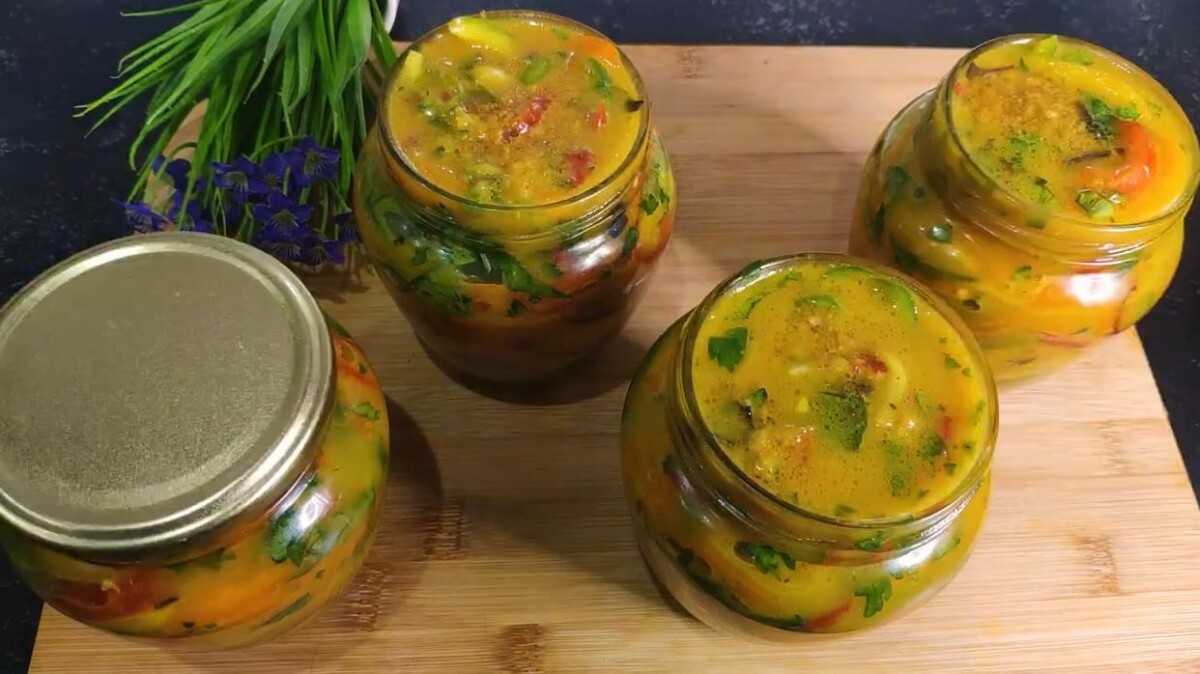 Залейте ним овощи. Помешайте, накройте крышкой и оставьте на столе на 1 час. Затем переложите в стерильную банку и уберите в холодильник еще на час.