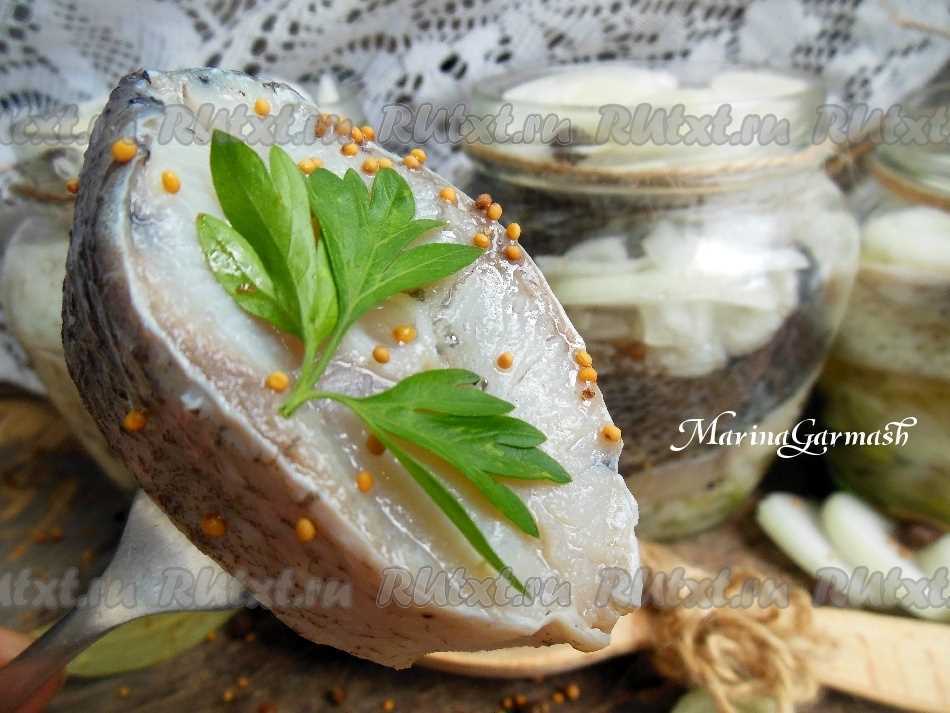 Спустя отведенное для засолки время, рыбу промыть от соли (не тщательно!), положить в чистую емкость и залить раствором уксуса (1 стакан воды + 1 стакан уксуса). Жидкость должна полностью скрыть рыбу.