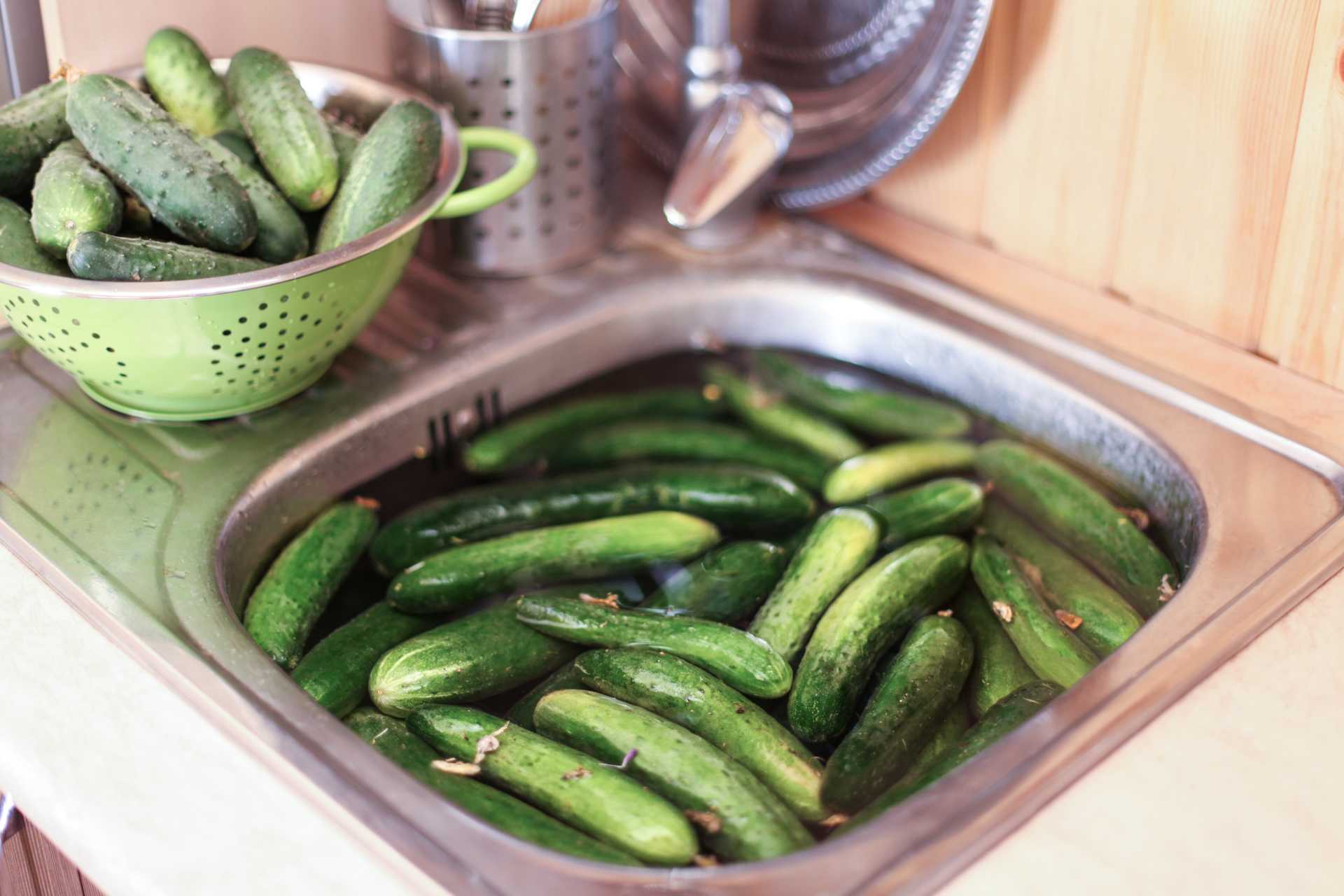 Овощи хорошо помыть, убрать поврежденные и обрезать хвостики. После предварительной обработки огурцы для придания им хрусткости заливают холодной водой на 3-4 часа. После выстаивания овощи еще раз промывают и закладывают в эмалированную емкость с толстыми стенами