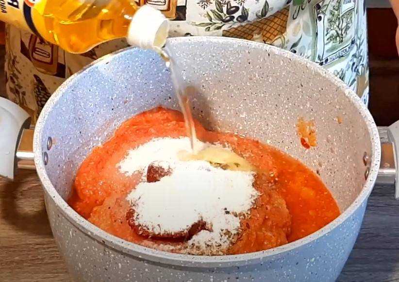 - Когда смесь проварилась – добавить пасту из томатов, уксус, чеснок. Содержимое кастрюли хорошо перемешать и варить еще не более 5-ти минут.