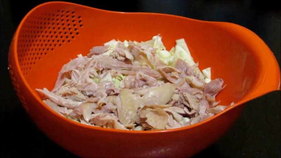 - Куриное мясо отделите от костей, очистите от шкурки. Порежьте кусочками среднего размера.