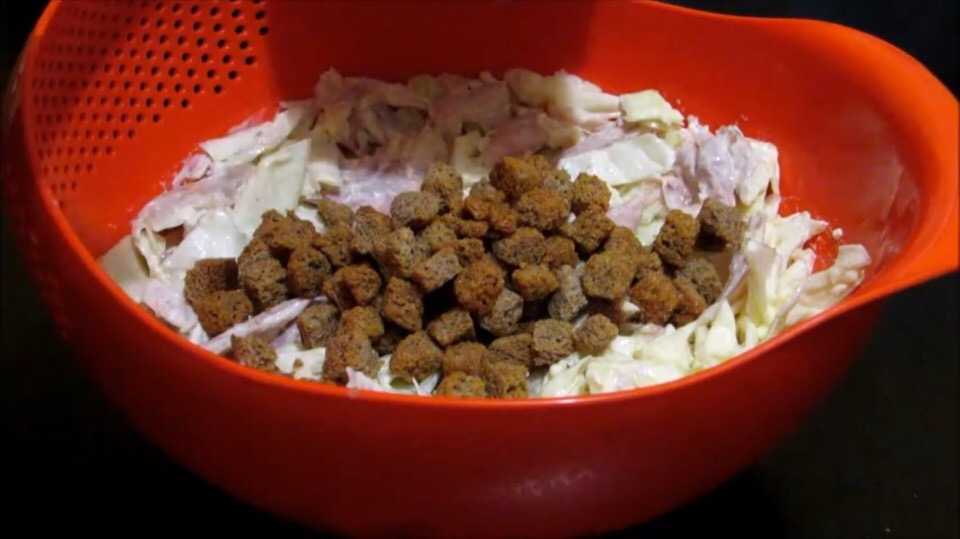 Готовим соус: майонез соединяем с выдавленным зубчиком чеснока и перцем. Заправляем салат. Перед подачей сверху посыпаем сухарями.