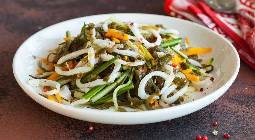 Рецепт салата из консервированной морской капусты с кальмарами и яйцом