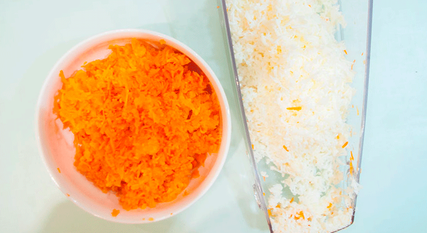 - Отварите морковь с картошкой и измельчите овощи на крупной терке.