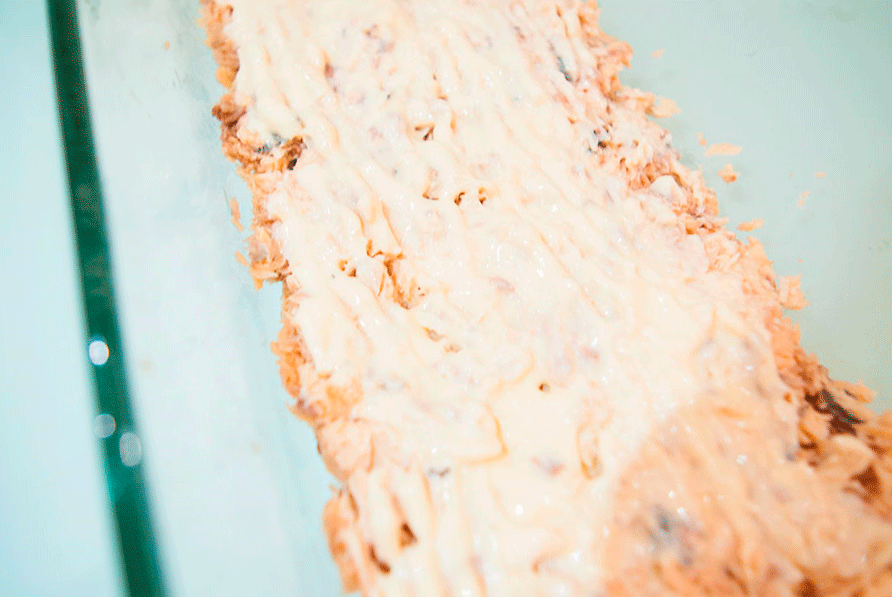 5. Ровно распределить рыбу на дне салатницы, сверху смазать майонезом.