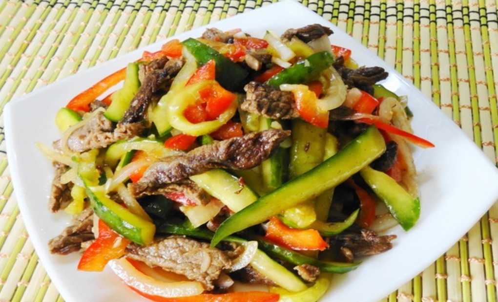 - Выложите его на блюдо с другими измельченными овощами. Добавьте маринованные, а после обжаренные мясные кусочки.