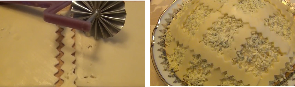 6. Теперь начинаем украшать наш салат. Нам понадобится 1 или 2 пластинки сыра для бутербродов. С помощью валика с зубчиками нарезаем длинные резные полоски из сыра и укладываем их по длине салата, чтобы получились квадраты.