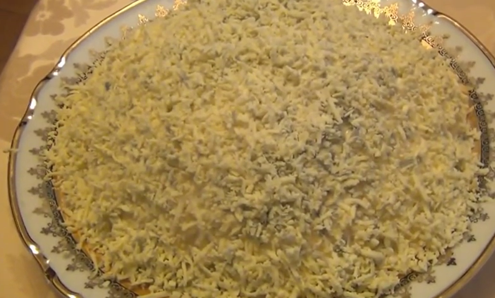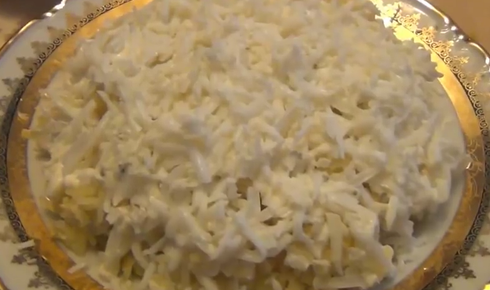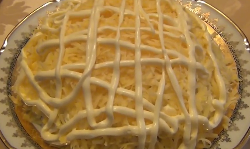 4. Сыр натираем на крупной терке, опять покрываем его майонезной сеточкой.