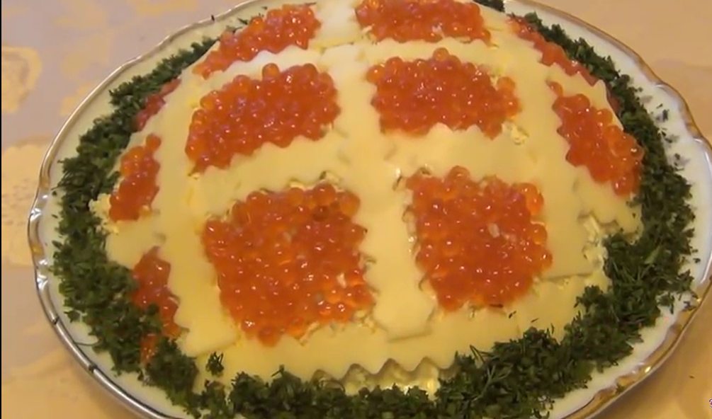 7. В эти квадратики раскладываем красную икру, а основание салата у тарелки обкладываем мелко нарезанным укропом.