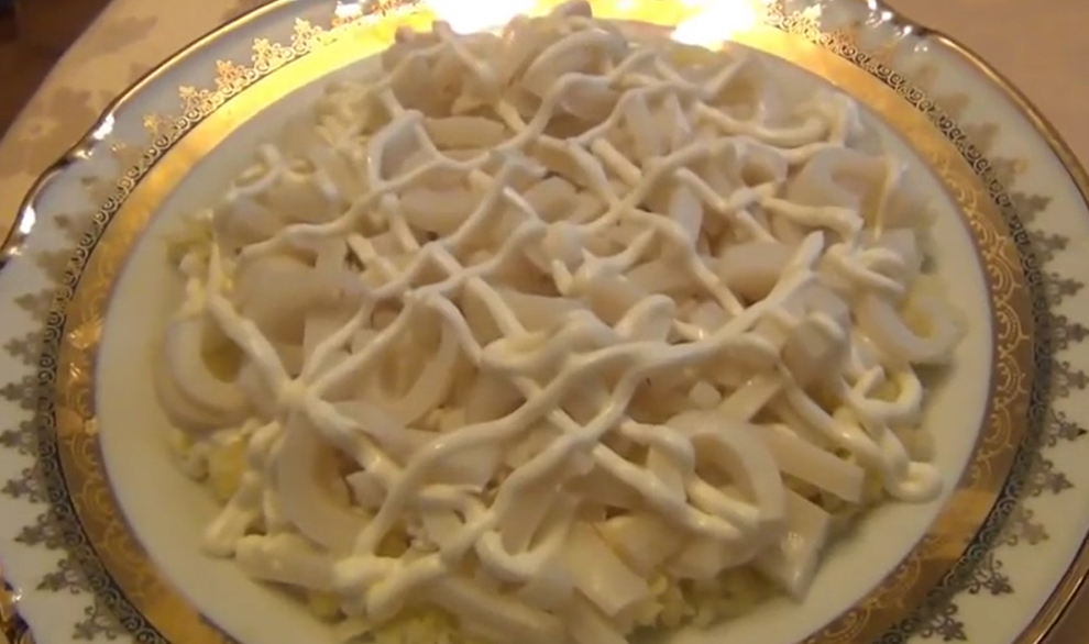 2. Кальмары чистим от пленок и отвариваем в соленой воде 1,5 — 2 минуты. После того, как они остынут, нарезаем кальмары соломкой и укладываем вторым слоем. Сверху снова делаем сеточку из майонеза.