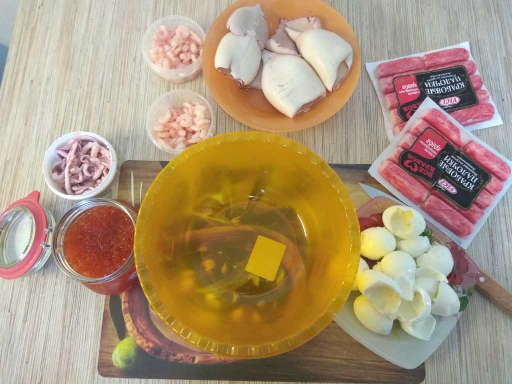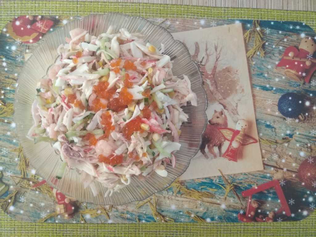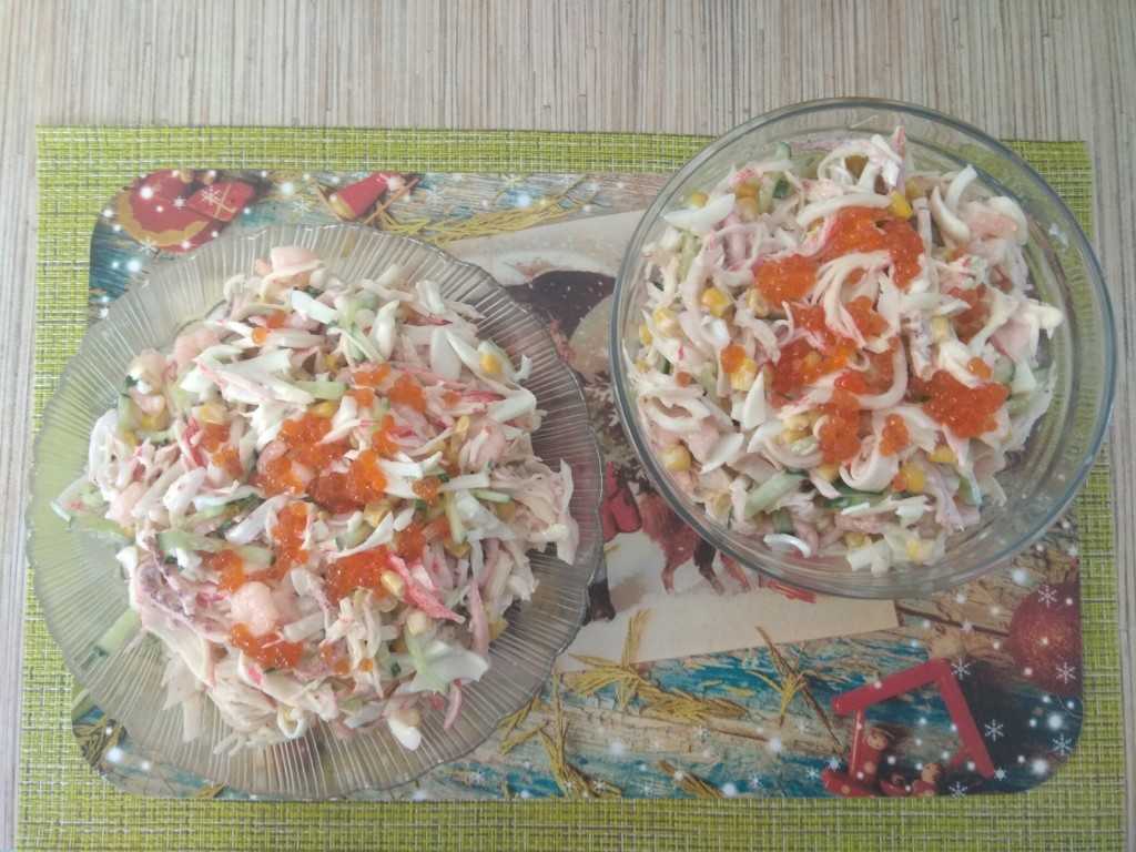 Праздничный салат с кальмарами, крабовыми палочками, яйцом и красной икрой