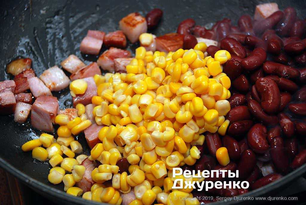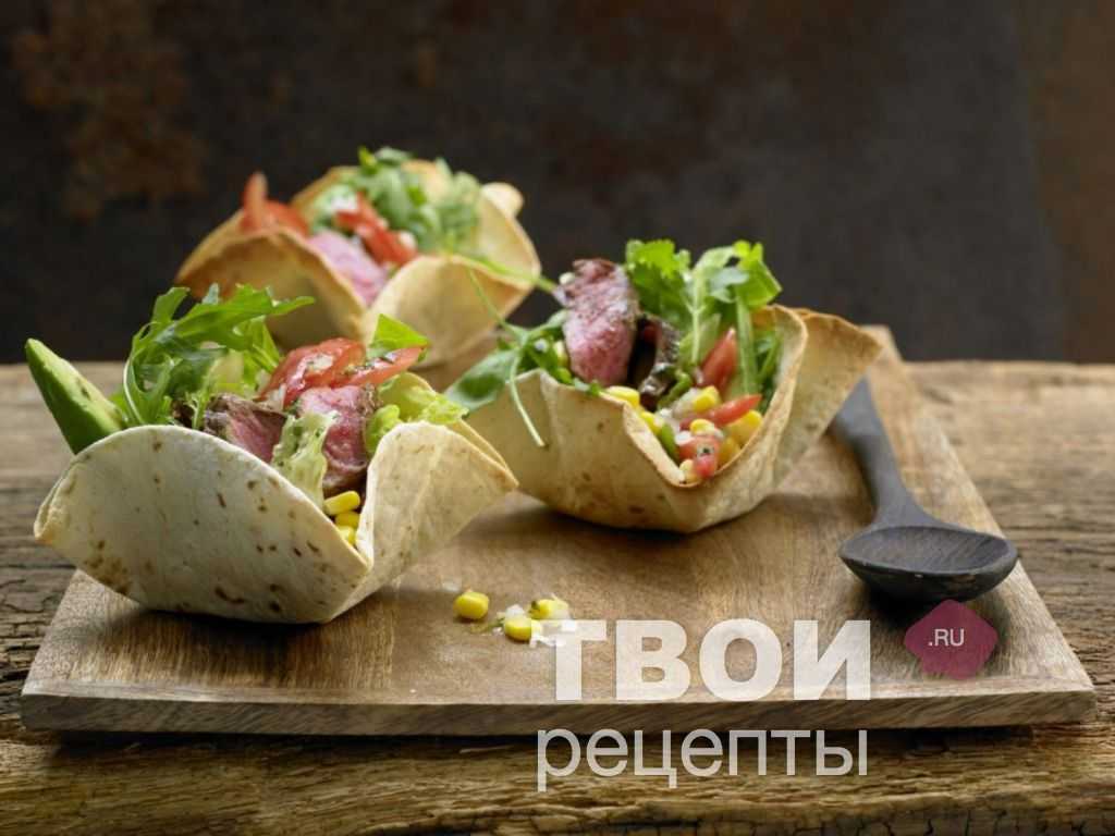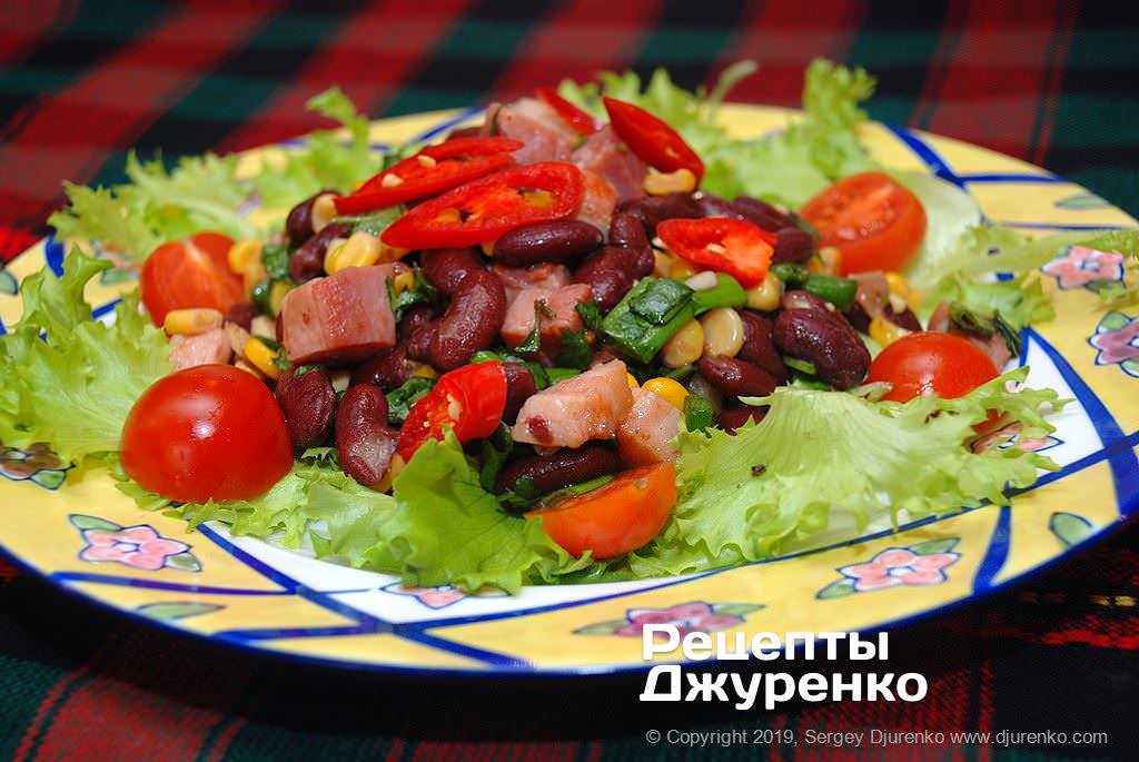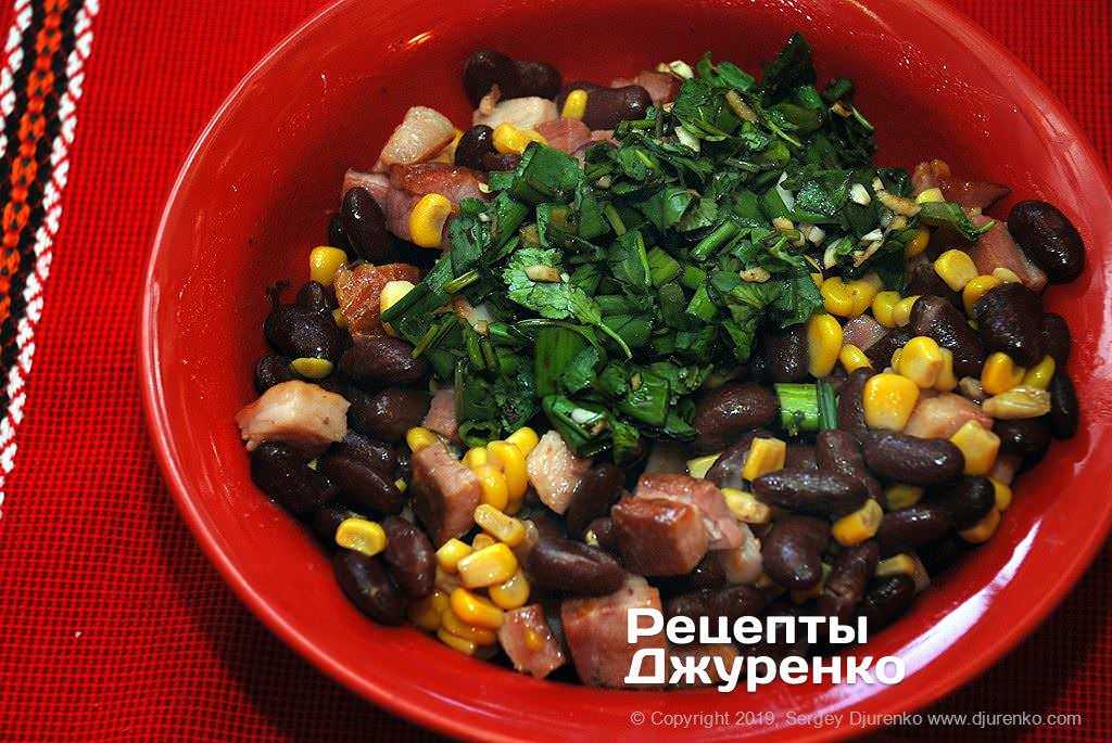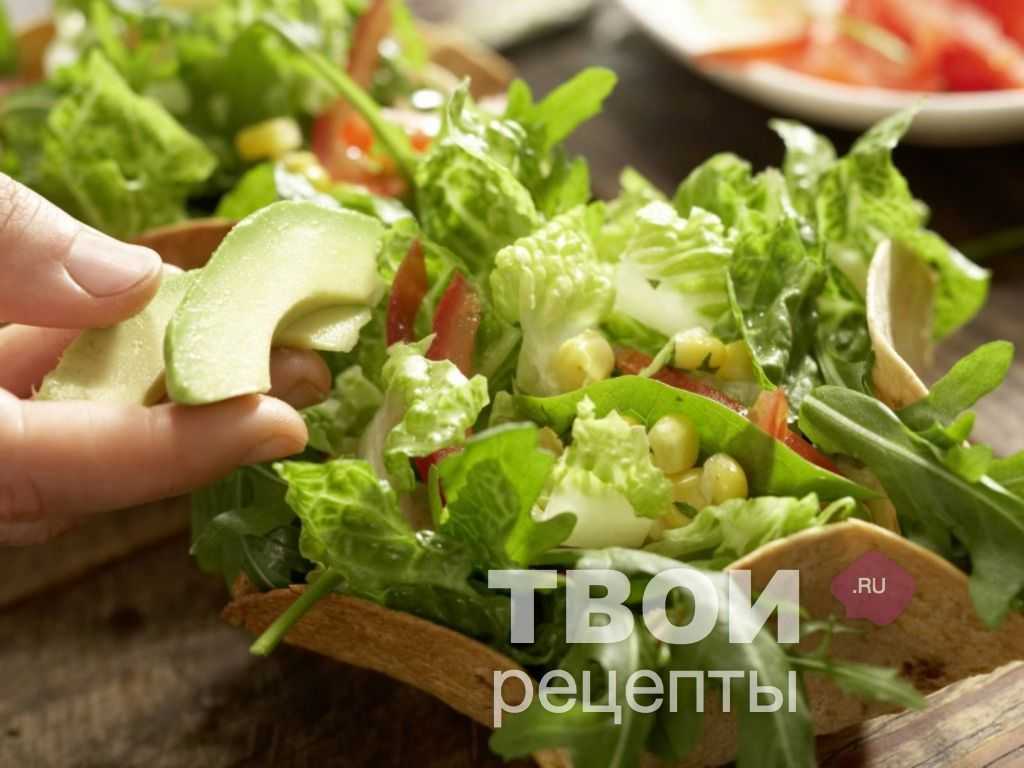 смешайте кукурузу, листья салата, помидоры, лук и соус. Добавьте ломтики авокадо.