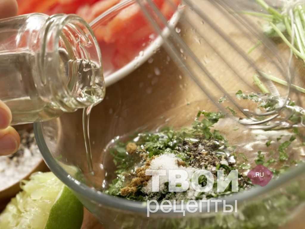 В миске смешайте кориандр, сок лайма, уксус винный, тмин, соль, перец и сахар. Добавьте немного масла оливкового. Это наш соус.