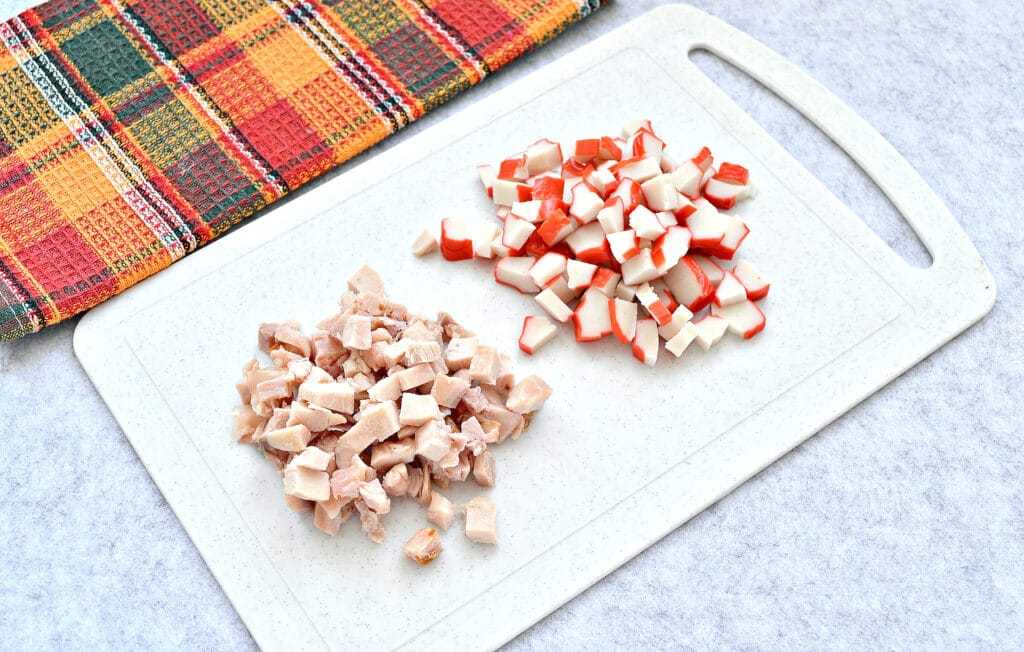 Копченое куриное мясо и крабовые палочки нарезаем в форме кубиков.