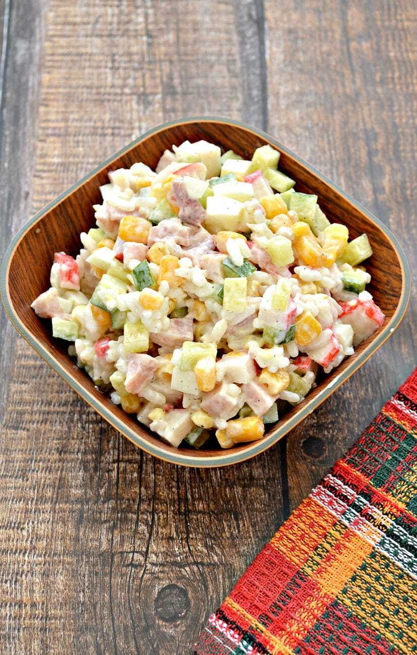 Рецепт 1: салат с рисом и кукурузой (пошаговые фото)