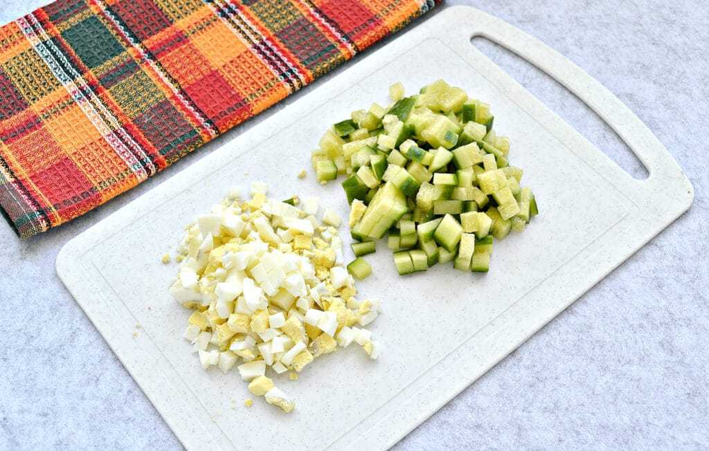 Соразмерными кубиками измельчаем свежий огурец и отварные куриные яйца.