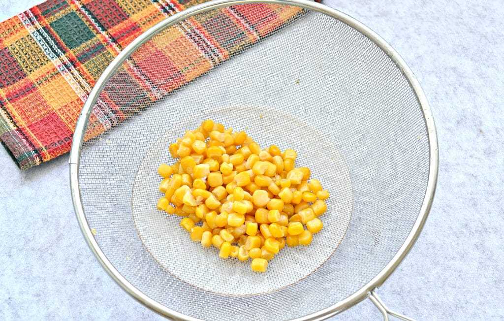 Зерна консервированной кукурузы откидываем на дуршлаг или сито, чтобы слить сок.