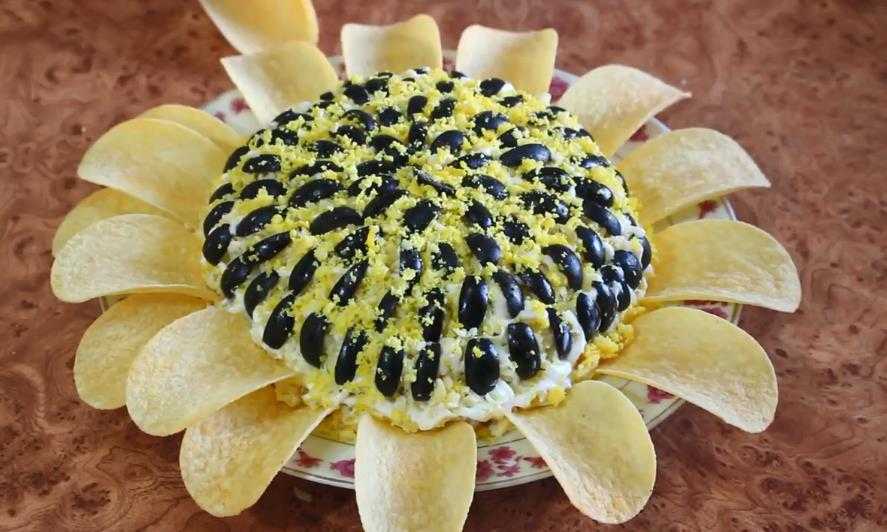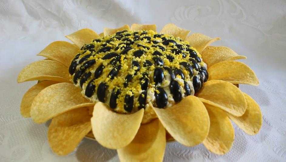 Смазать поверхность салата майонезом, выложить по ней маслины в виде семечек. Вокруг по краям распределить чипсы в 2 ряда, украсить натертым на мелкой терке яичным желтком.