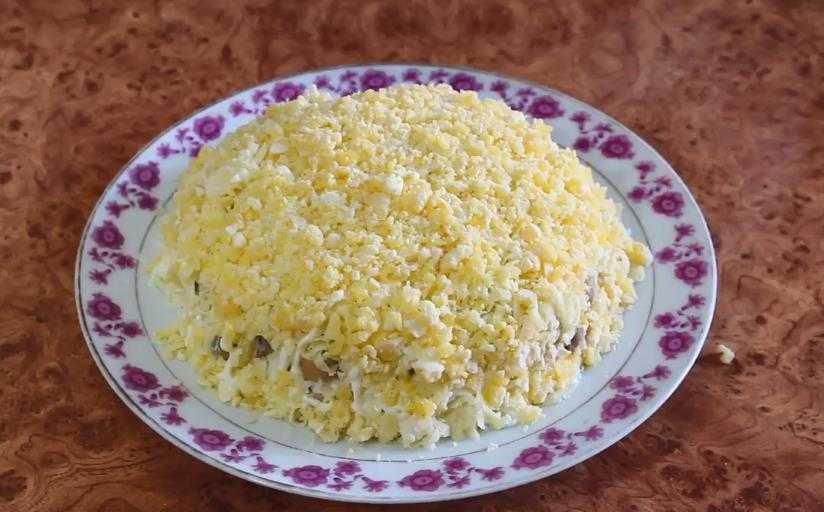 Еще один слоеный салат с жареными грибами и копченой курицей, который можно смело подавать на праздник. Он получается очень вкусным благодаря гармоничному сочетанию продуктов.