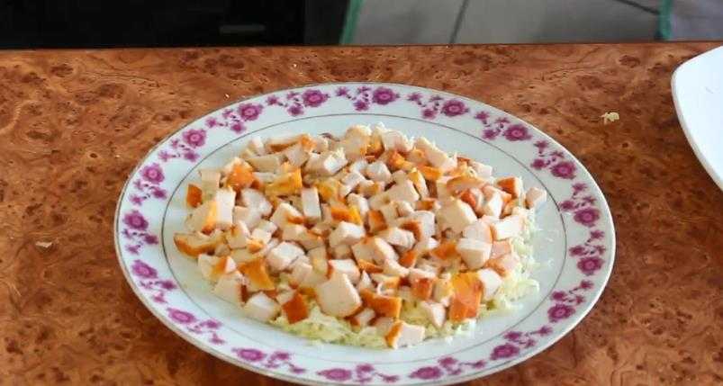 Салат Подсолнух с копченой курицей и маринованными грибами