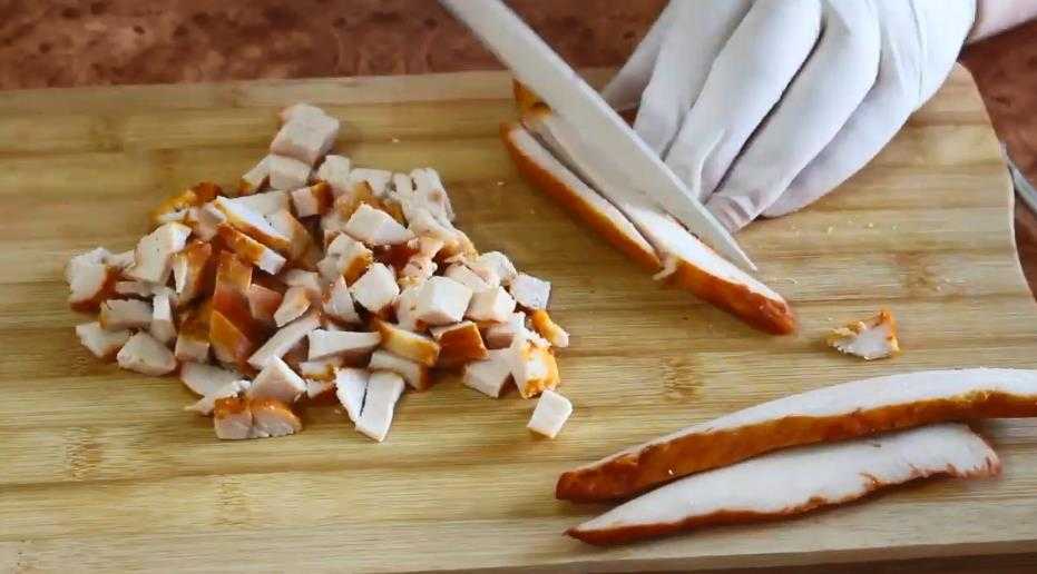 3. Далее куриное мясо остудите и нарежьте острым ножом на кусочки.