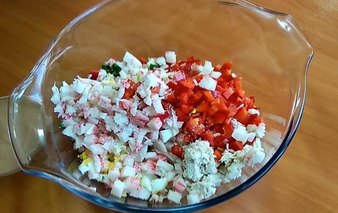 - Лук мелко нашинкуйте и посыпьте поверх крабового мяса.