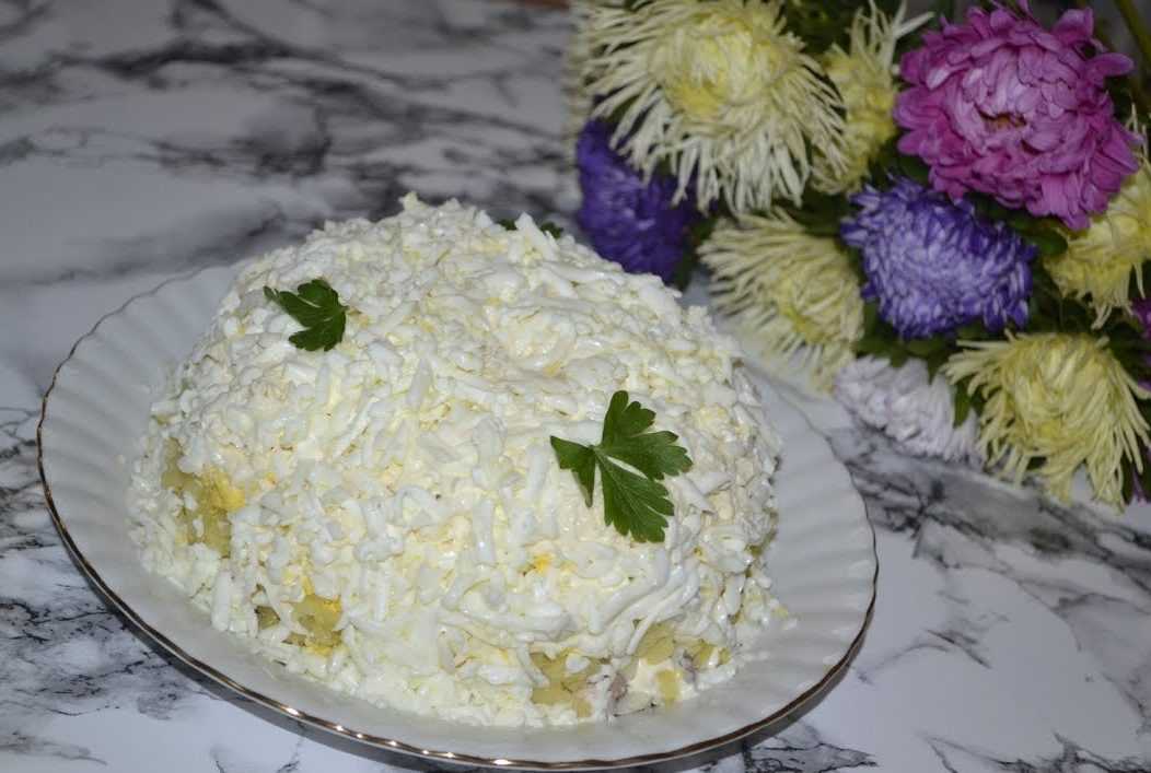 11. А после высыпаем натертые на терке белки и снова поливаем майонезом.