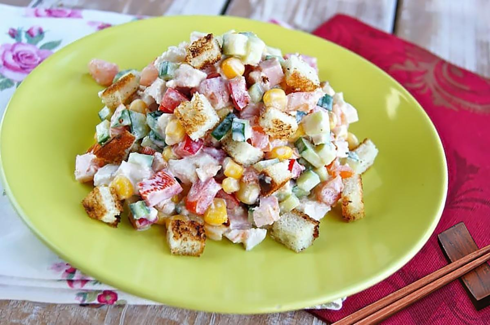 Достаточно часто подобные салаты делают с копченой курицей. Более яркий вкус и аромат дымка хорошо сочетаются с нежностью яиц и овощей. Копченая грудка, ножки, крылышки – это уже зависит от личных предпочтений.
