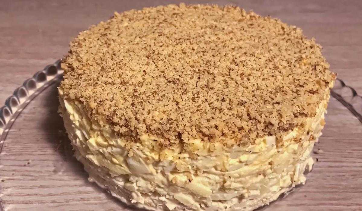 Его называют так за воздушный белый верх, напоминающий фату и прочие свадебные атрибуты. Салат получается нежный и смотрится весьма нарядно и празднично, а если заменить отварное филе копченой курицей, вкус будет более ярким.