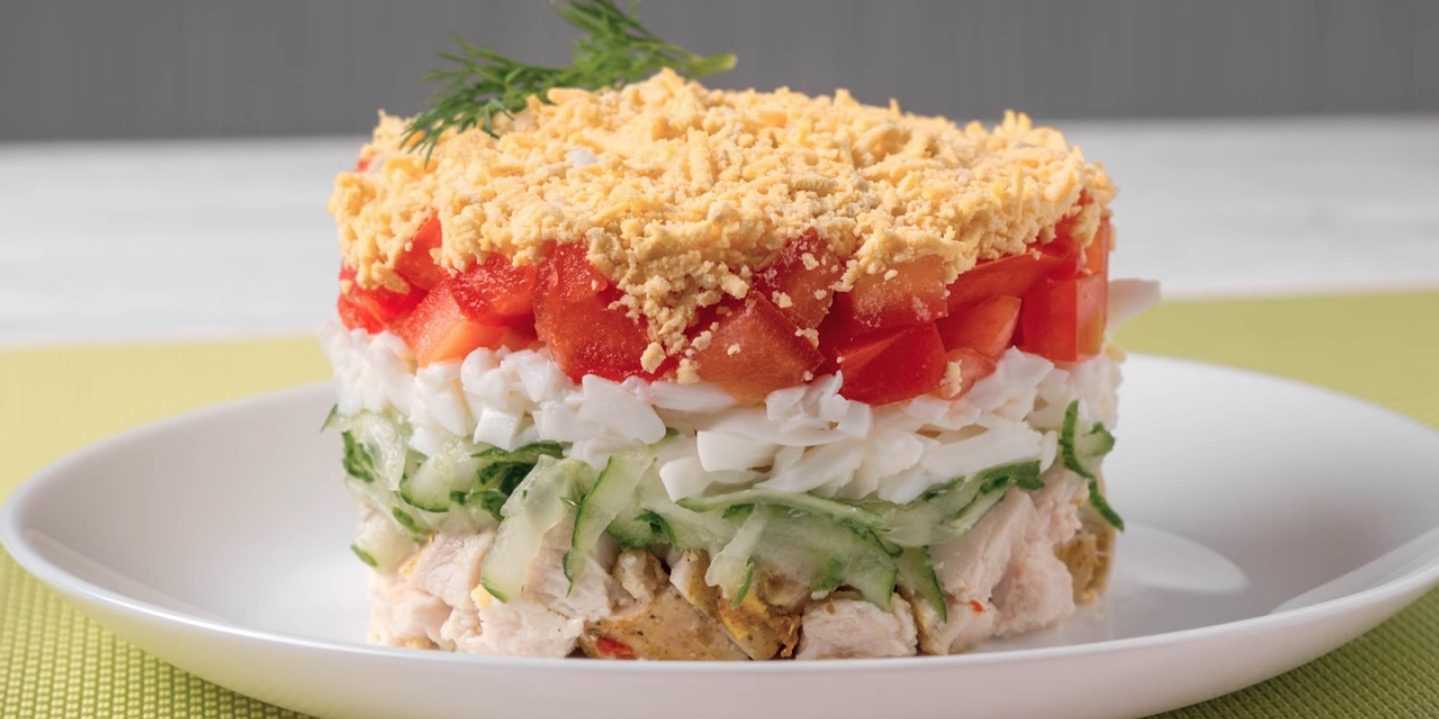 Салат из курицы с сыром, яйцами и помидором (слоями)