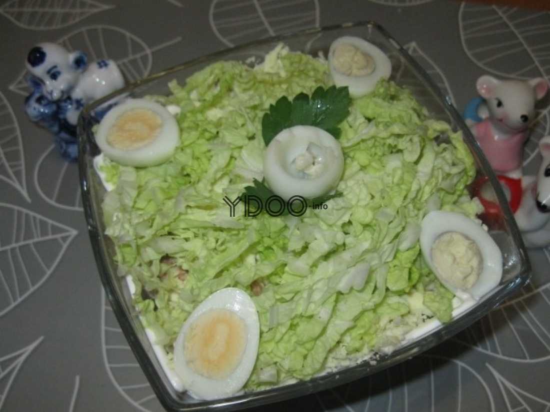 Завершить приготовление слоем пекинской капусты. Готовый салат получается нежным и воздушным, как пух лебедя. Такое удивительно состояние достигается путем натирания большинства ингредиентов на терке и за счет тонко нарезанной пекинской капусты.