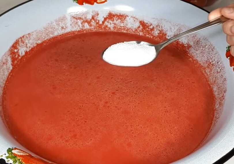 6. За это время подготовим томатный сок для заливки. Для этого на каждый литр сока добавляем 1 столовую ложку соли (без горки).