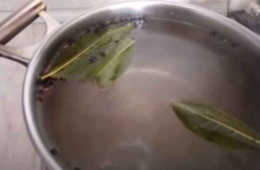 Теперь переходим к подготовке маринада. Ставим кипятиться воду. Всыпаем сюда соль, сахарный песок. Добавляем 3-4 лавровых листа и горошковый перчик по вкусу. Если хотите, можете кинуть пару-тройку бутонов гвоздики.