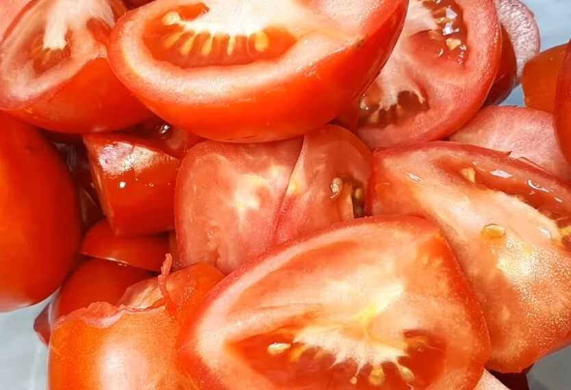Помидоры моем, обтираем полотенцем. Режем их аккуратными дольками. Они не должны быть мелкими. Но, при этом, кусочки должно быть удобно поместить в рот.