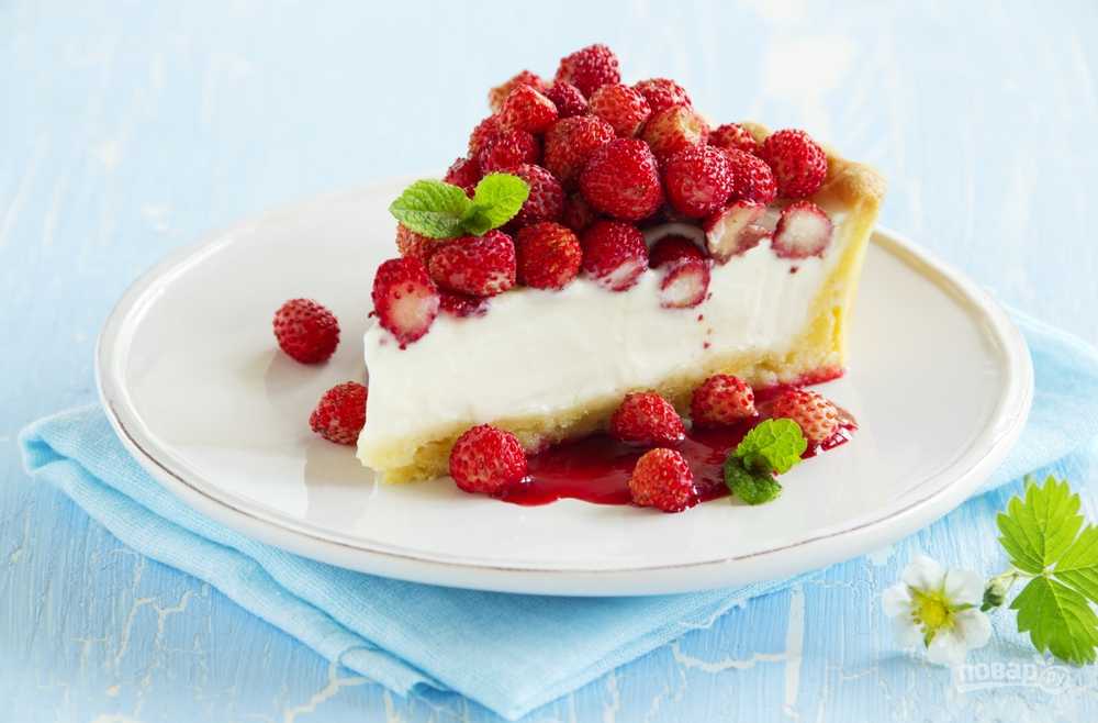 В глубокой миске взбейте миксером маскарпоне, сливки и сахар. Выложите начинку в тарт, сверху распределите ягоды. В сотейнике прогрейте джем до густоты сиропа. Теплым джемом смажьте землянику и подавайте пирог к чаю. Приятного аппетита!