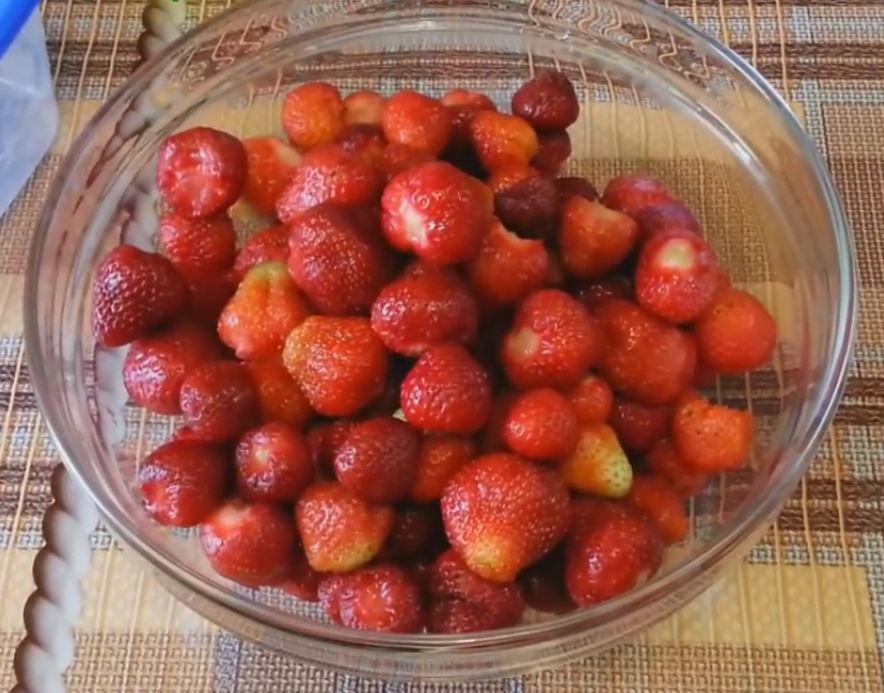 - Ягоды должны быть красными и достаточно плотными, главное, неперезрелыми. Клубнику хорошо моем и отрываем чашелистики.