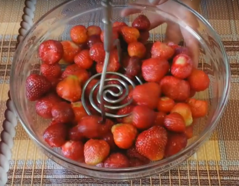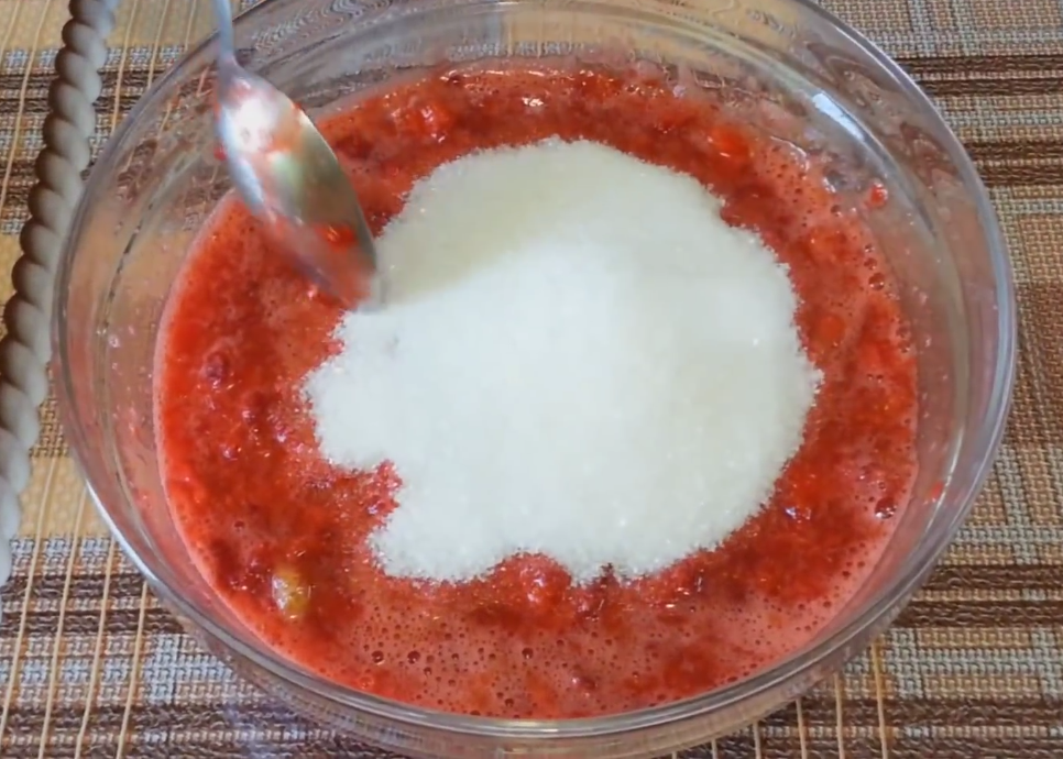1. Клубнику перетираем с половиной сахара с помощью блендера до однородности.