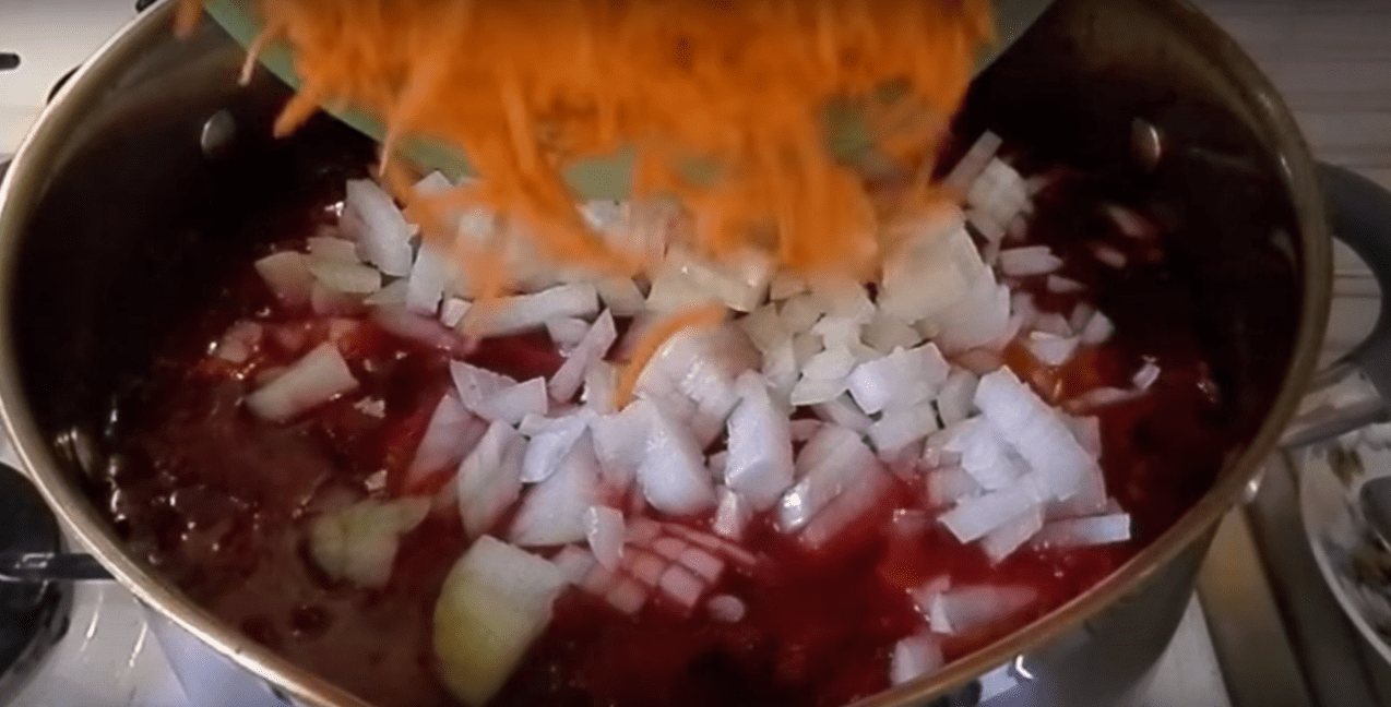 Овощи нужно обжарить в растительном масле — вначале жарим лук, морковь,добавляем перец, после чего выкладываем свеклу и заливаем это все полученным томатным соком. Старайтесь тушить овощи на среднем огне примерно 10-15 минут, чтобы они не получились слишком переваренными.