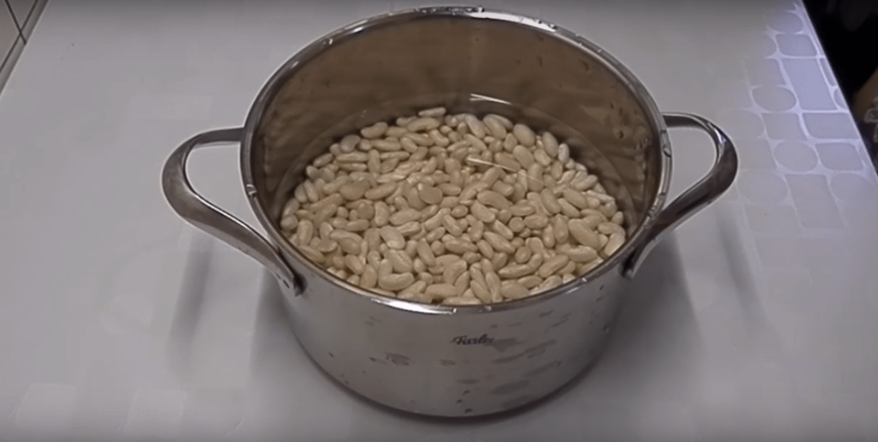 Фасоль у меня белая, но можно использовать любую. Ее нужно с вечера залить водой, утром слить воду и хорошо промыть, залить водой в кастрюле так, чтобы она была на 2 пальца покрыта водой.