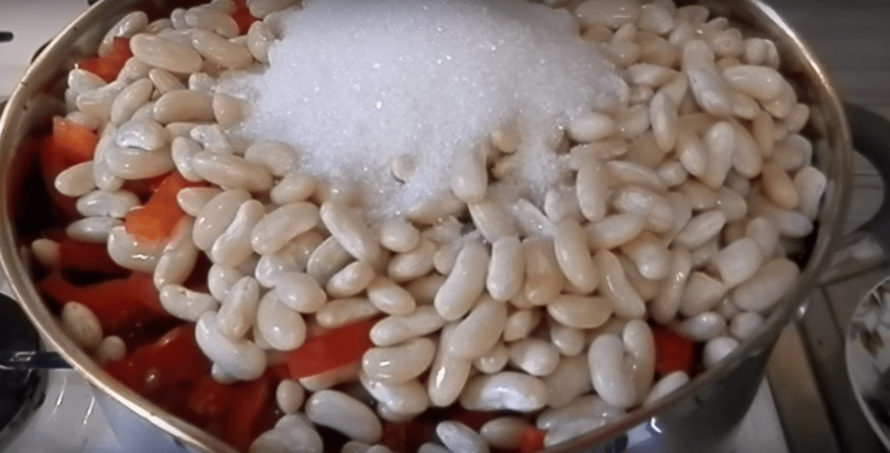 Через 10 минут добавляем фасоль, сладкий перец, хорошо перемешиваем. Кладем сахар по вкусу. Я добавляю 100 грамм сахара, и столовую ложку соли.