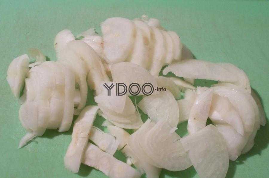 - Лук, освободив от шелухи, порежьте тонкими четвертинками колец.