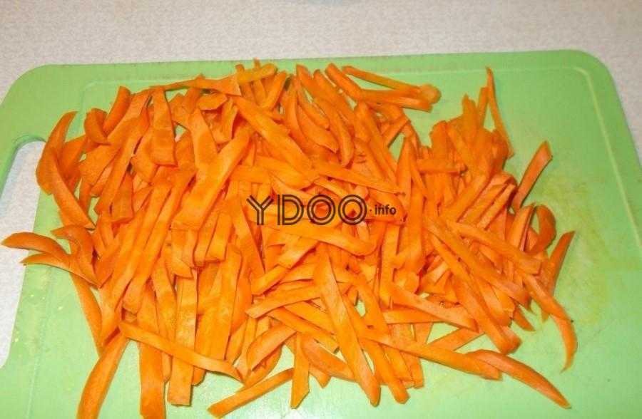 Мясо вымыть, обсушить. Нарезать полосками длиной около 5 см и шириной 3 см. Добавить к обжаренной моркови. Поперчить, посолить. Тушить 40 минут на слабом огне.