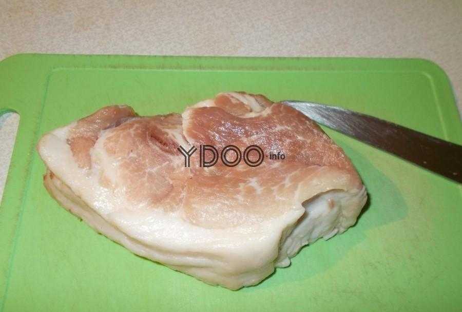 1. Мясо нарезать кусочками 5-7 см, можно вместе с жировыми прослойками.