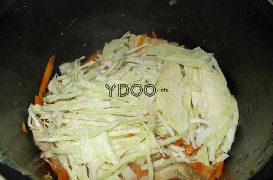 По истечении 20 – 25 минут, в чашу мультиварки нужно выложите свежую капусту и томатную пасту. Всё перемешайте. Если есть необходимость, добавьте ещё немного воды.