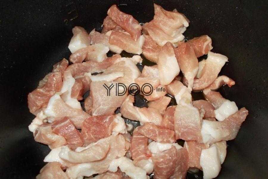 Когда грибы, лук и чеснок готовы, переложите их в удобную миску или тарелку. Чашу мультиварки протрите (при необходимости). Выложите на дно устройства смалец – пусть он хорошо прогреется. Программу приготовления не меняйте, пока работаете с «Обжариванием». На раскалённое топленое сало выложите кусочки свинины. Обжарьте их до образования румяной корочки. Это займёт около 20 минут Вашего времени. Мясо жарьте под открытой крышкой, периодически помешивая его. Затем выложите в мультиварку 200 грамм квашеной капусты и налейте немного кипячёной горячей воды. Крышку устройства закрывайте и готовьте блюдо дальше на программе «ТУШЕНИЕ».