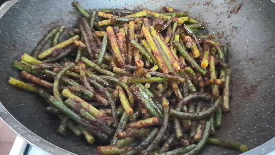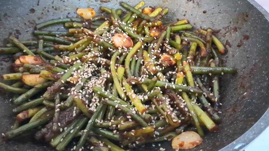 В масле, в котором жарился чеснок, обжарить соевую пасту с соевым соусом, красным и черным перцами. Быстро перемешать со сливовым сиропом и чесночными стрелками, подержать на огне в течение 7 минут.