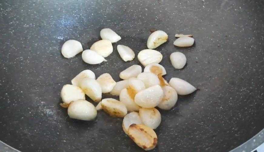 На раскаленном растительном масле обжарить зубки чеснока до золотистости, постоянно их перемешивая.