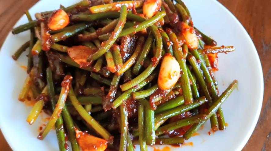 Чесночные стрелки с мясом — корейский салат с соевым соусом
