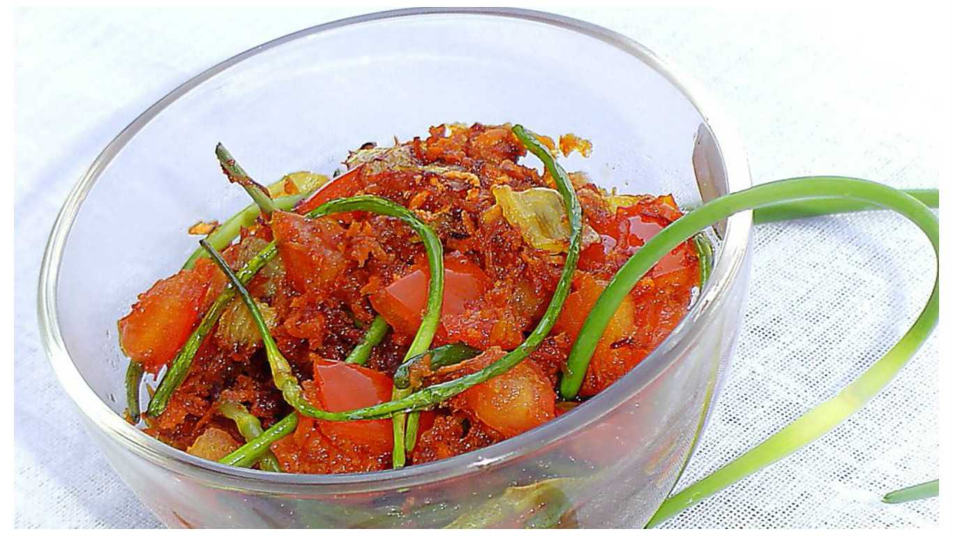 Согласно этому рецепту сначала готовятся отдельно стрелки и томат, затем они соединяются вместе.