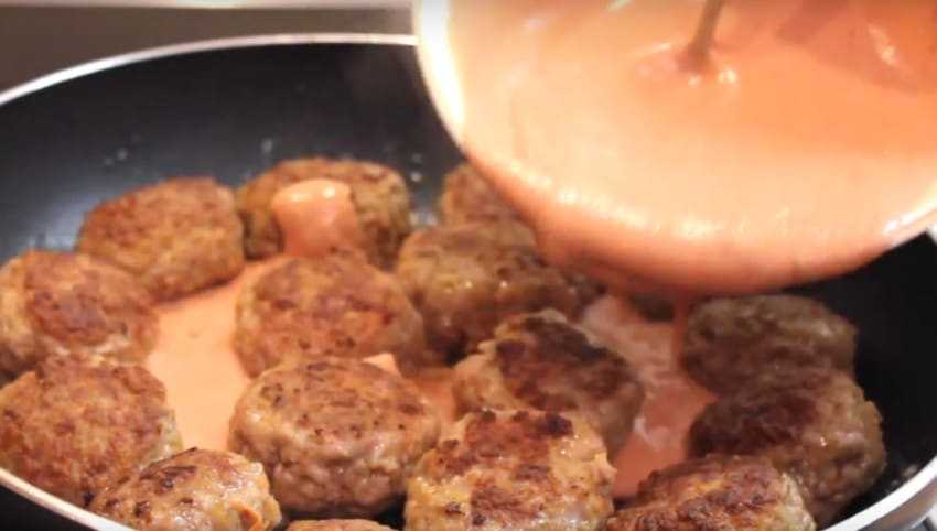 Рецепт приготовления ежиков из мяса с рисом в сметанном соусе на сковороде